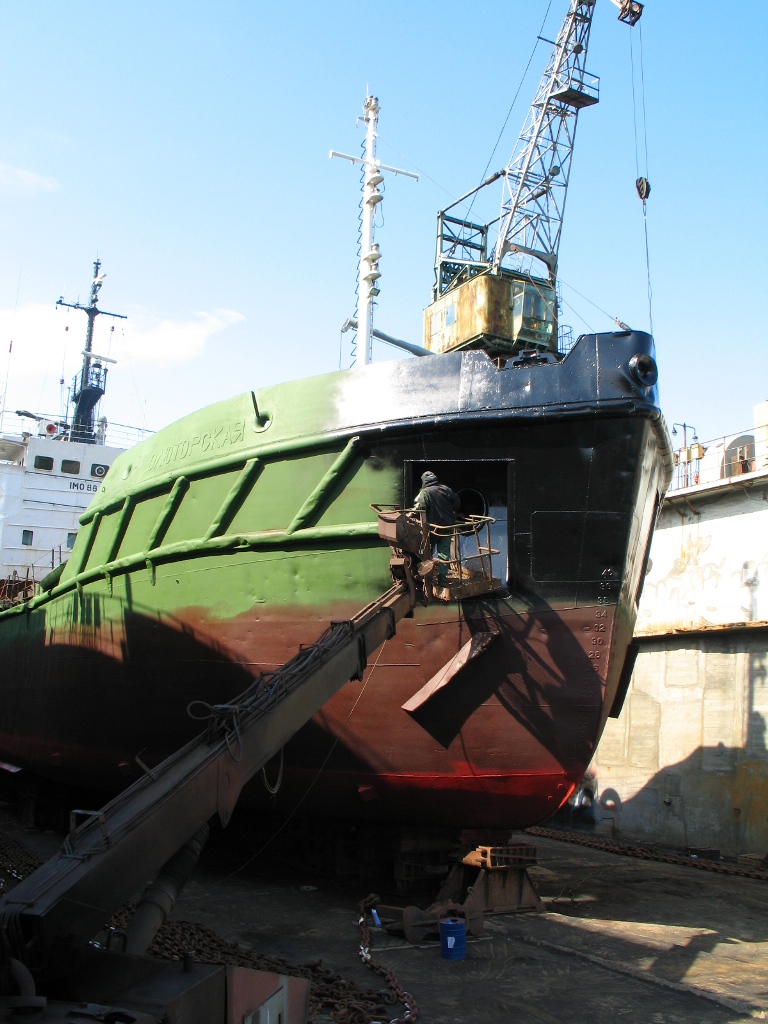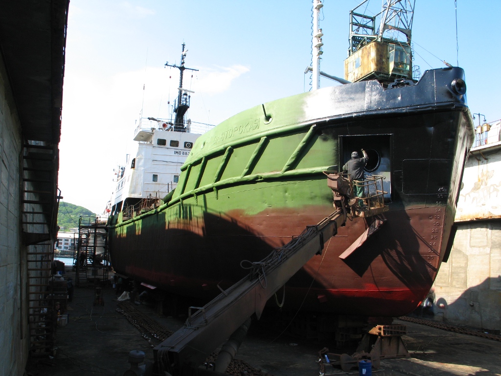 В плавдок №4 поднят теплоход «ВОСТОК» (судовладелец – ООО «Горняк-2», Сахалин). На судне запланирован большой объем ремонтных работ с предъявлением на класс Регистра РФ, в том числе – очистка, покраска корпуса, ремонт балластных танков, донно-забортной арматуры, якорных цепей, ревизия рулевого устройства.