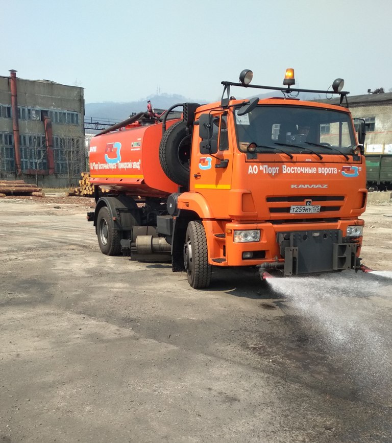 Данная машина также проводит ежедневный полив (утром и вечером) городских автомобильных и придомовых дорог в районе улиц Арсеньева и Пирогова, примыкающих к территории порта.