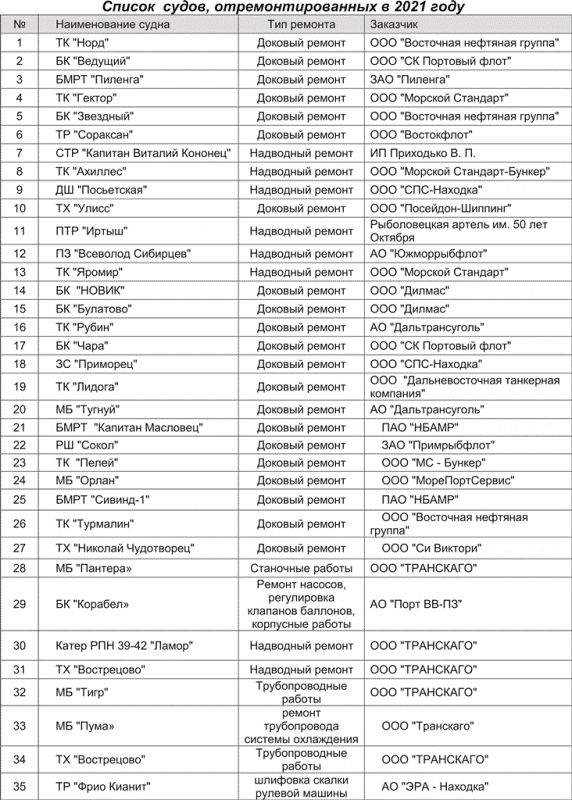 Ремонтировались суда традиционных заказчиков – БК «ВЕДУЩИЙ», БК «ЧАРА» (ООО «СК Портовый флот»), ДШ «ПОСЬЕТСКАЯ», ЗС «ПРИМОРЕЦ» (ООО «СПС-Находка»), МБ «ПАНТЕРА», ТХ «ВОСТРЕЦОВО», МБ «ПУМА» (ООО «ТРАНСКАГО»).