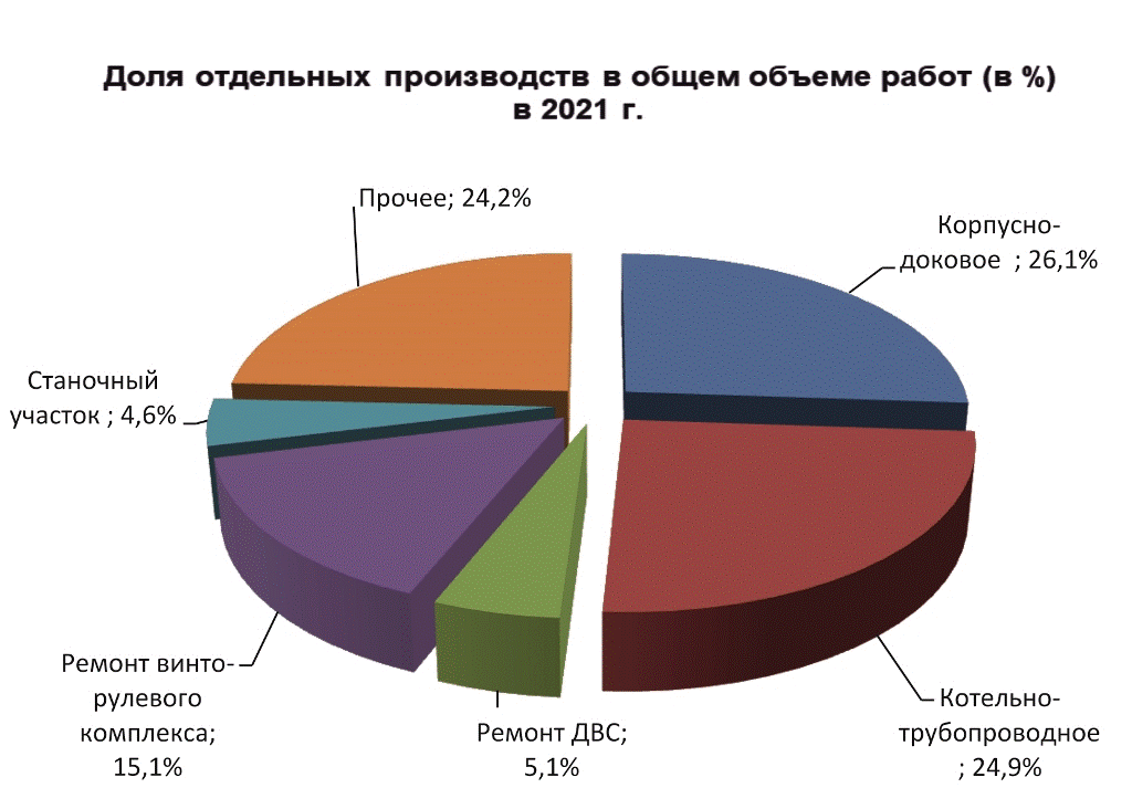 Как следует из отчета «Судоремонтного комплекса-ПЗ», за 2021 год был произведен ремонт на 35 судах, из них отдоковано в полном объеме 21 судно. Основная доля заказов приходилась на комплексные ремонты, выполнен значительный перечень работ по ремонту отдельных механизмов и систем, дизелей, трубопроводов, коленчатых валов и пр.