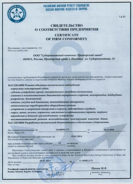 В декабре 2010 года «Судоремонтный комплекс-ПЗ» получил очередное Свидетельство «О соответствии предприятия требованиям Российского Морского Регистра судоходства» как предприятие, осуществляющее ремонт объектов технического наблюдения, а именно: