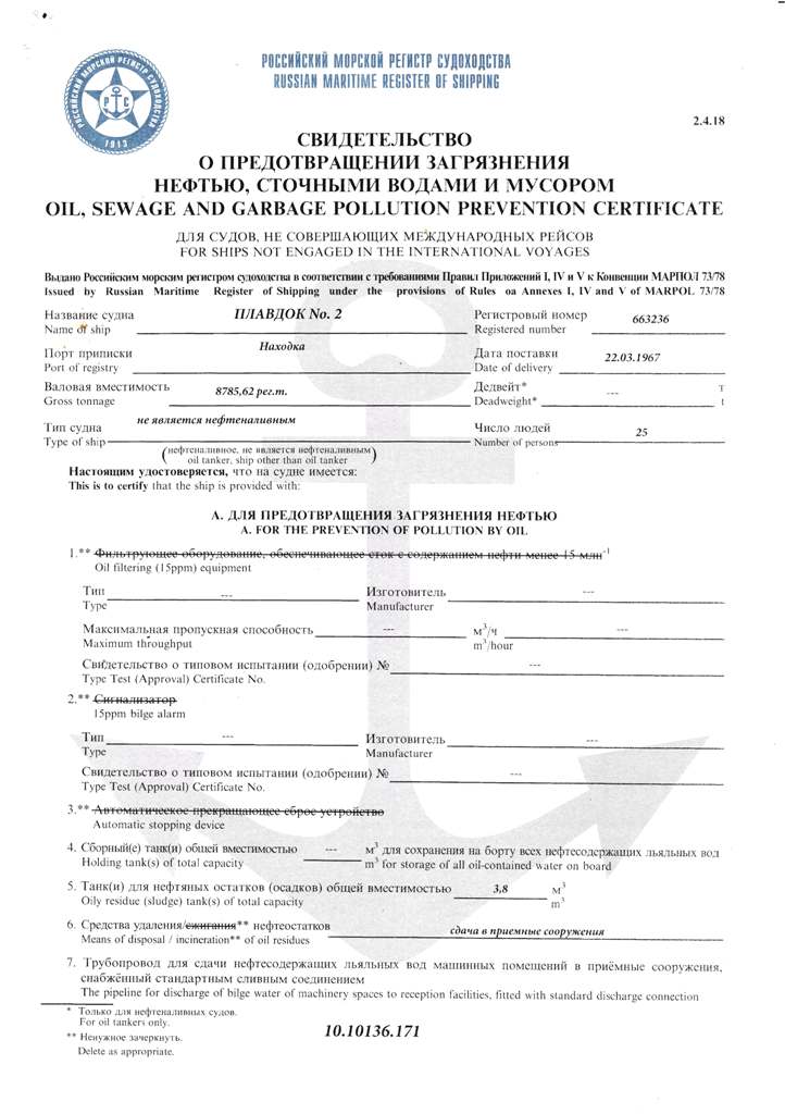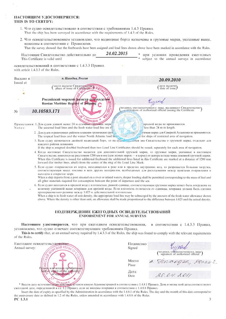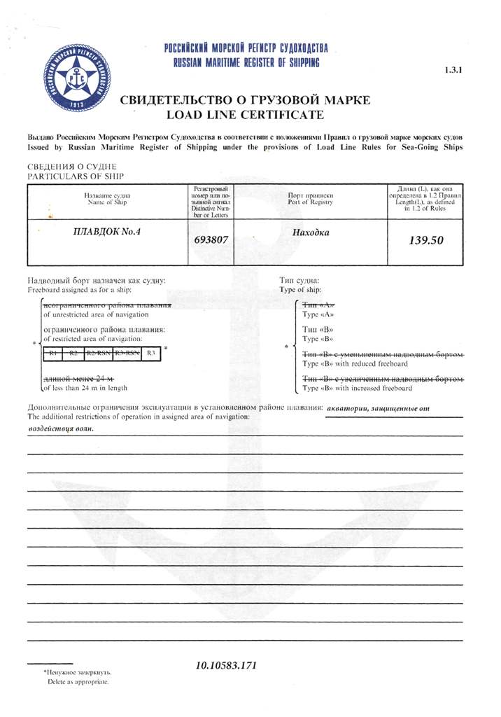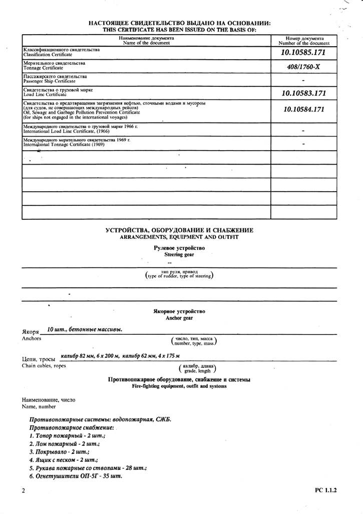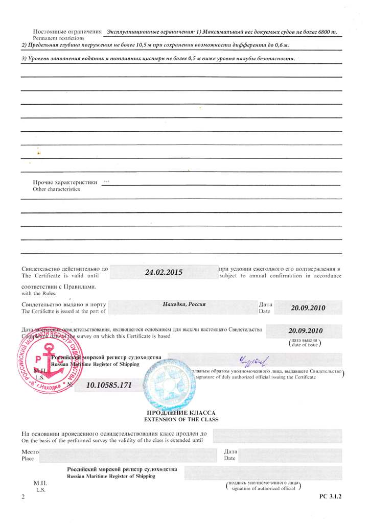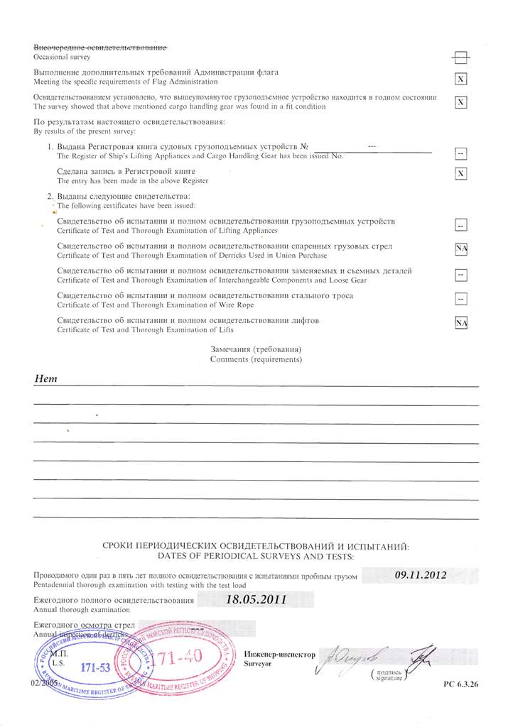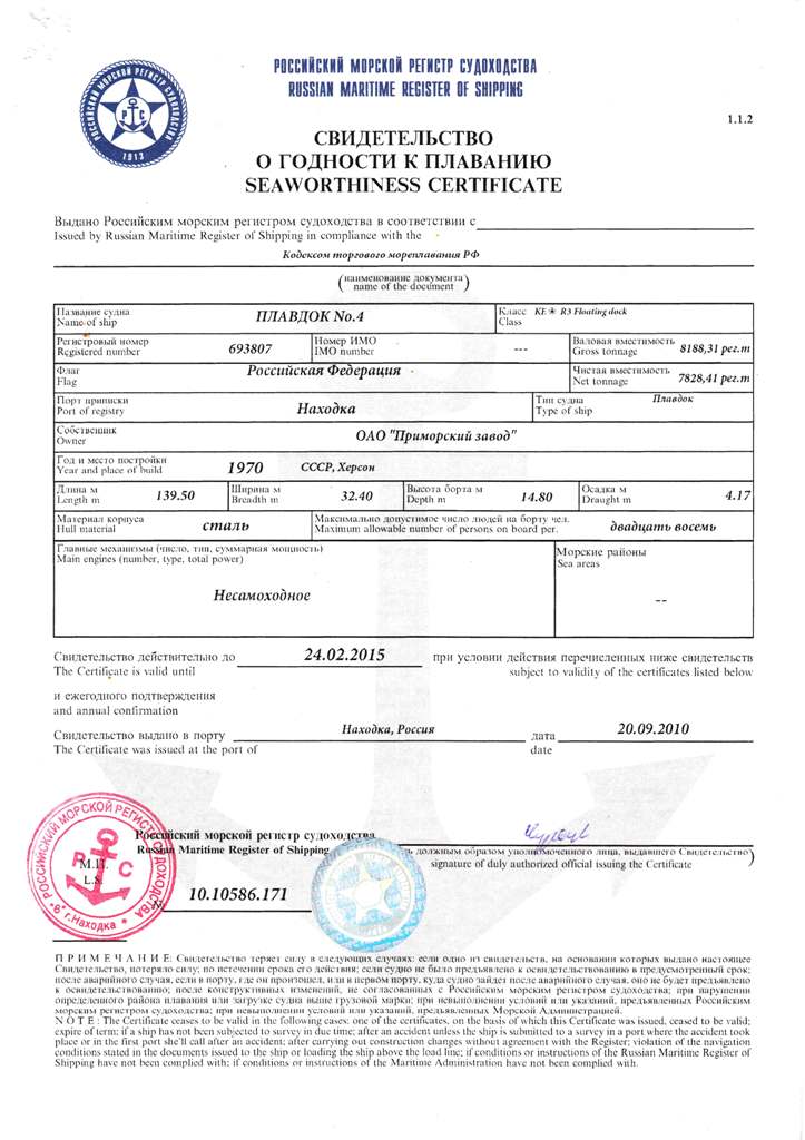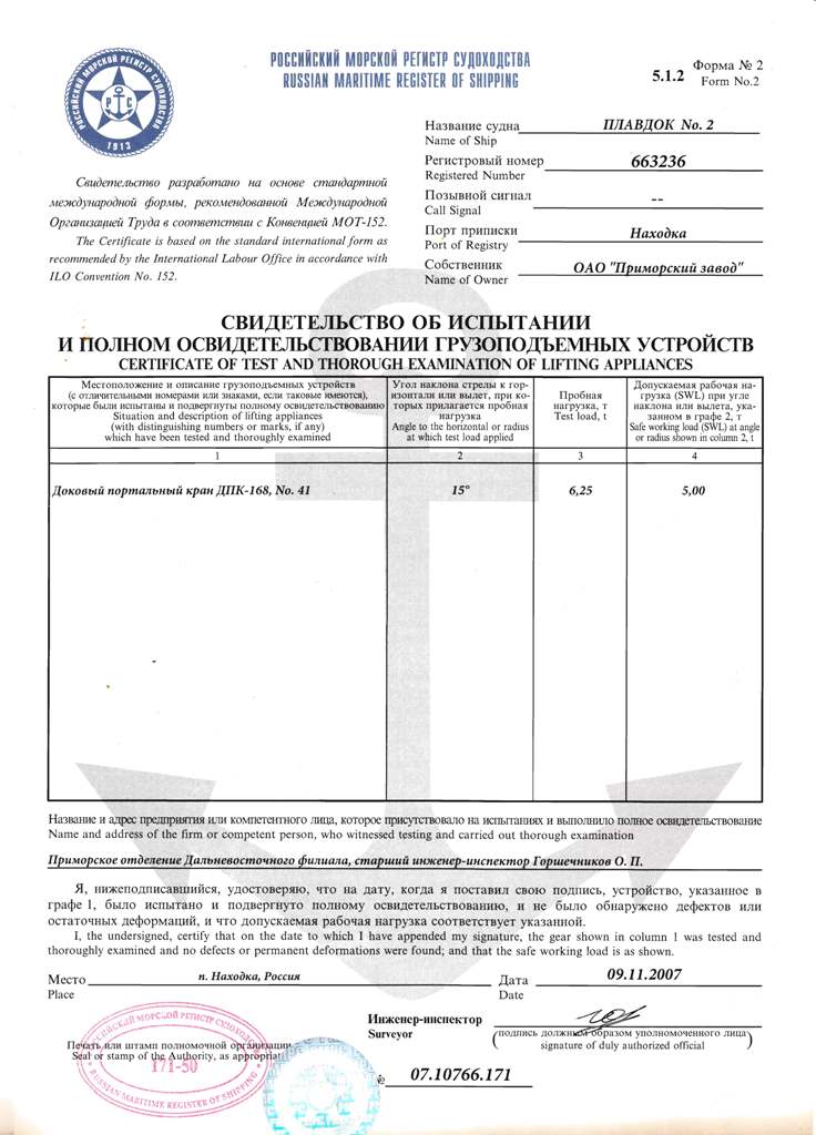Свидетельство об испытании и полном освидетельствовании докового портального крана ДПК-168, №41 - выдано Российским Морским Регистром судоходства 09.11.2007 г. Действительно до 09.11.2012