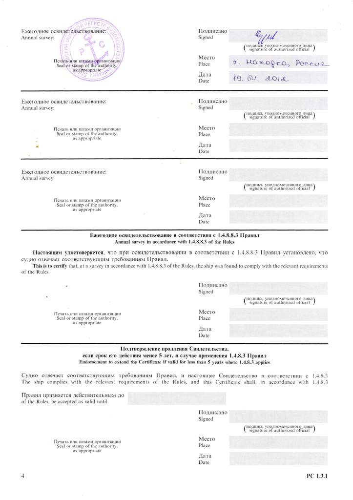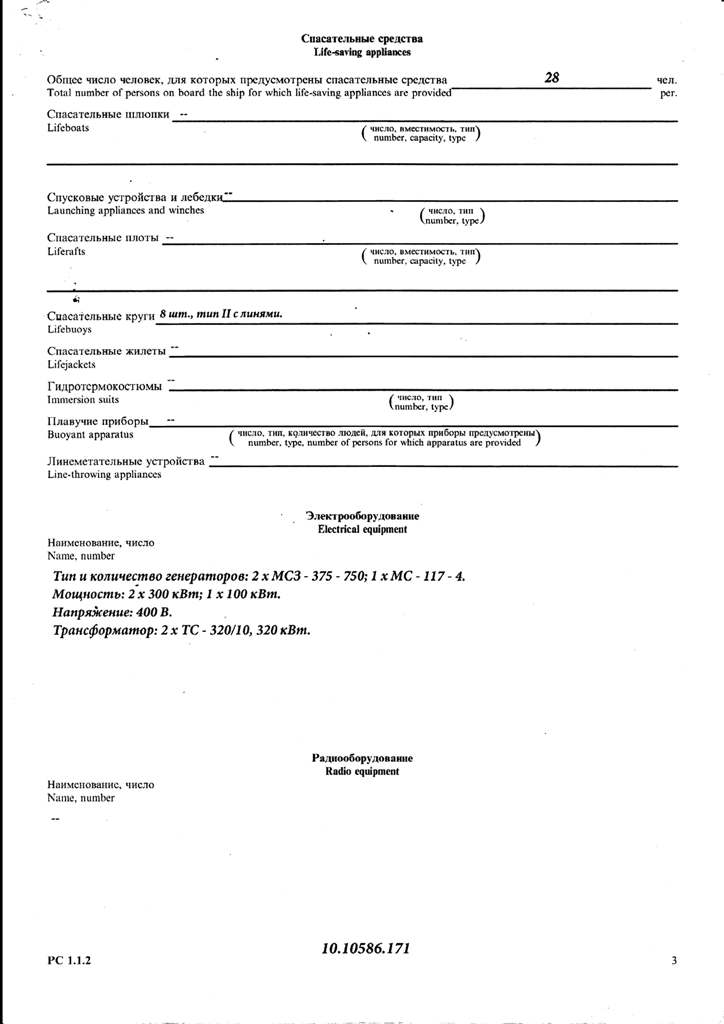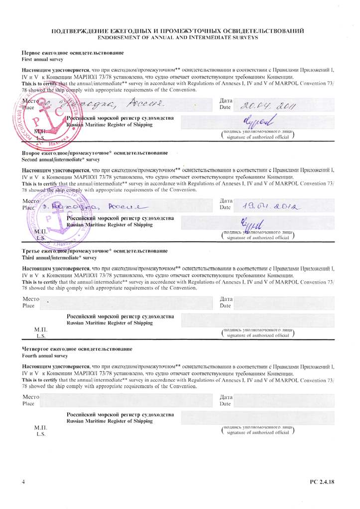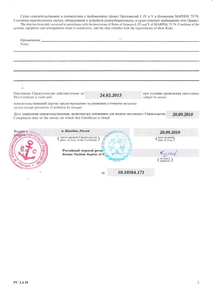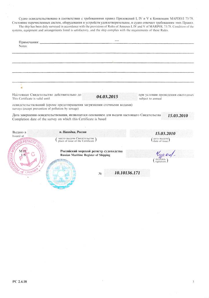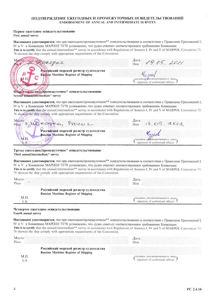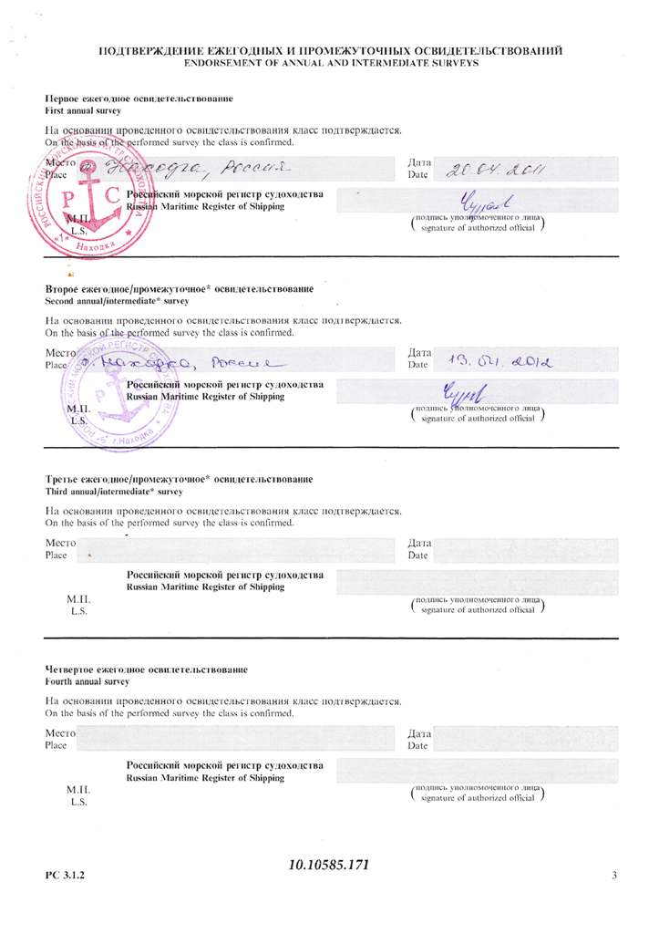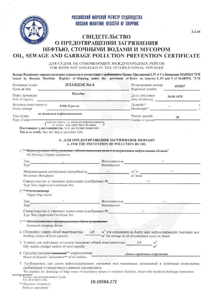 Свидетельство об испытании и полном освидетельствовании докового портального крана ДПК-168, №41 - выдано Российским Морским Регистром судоходства 09.11.2007 г. Действительно до 09.11.2012