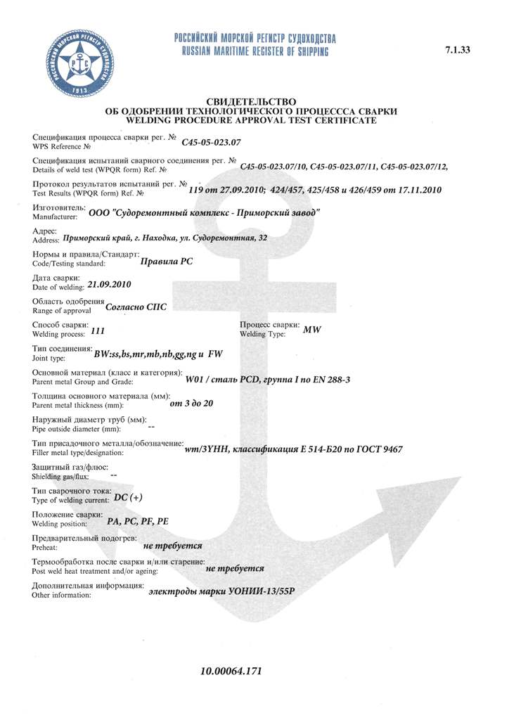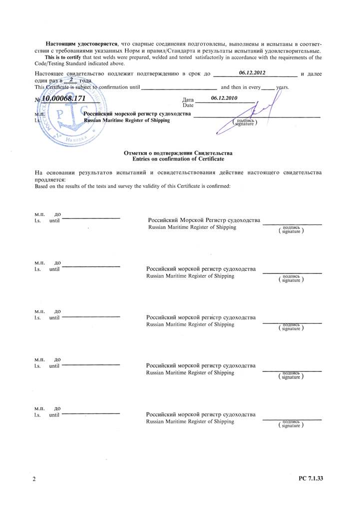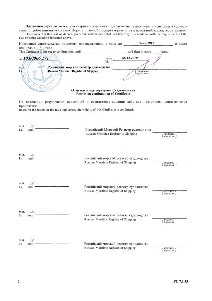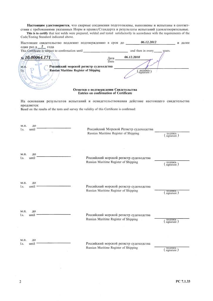 Свидетельство об одобрении технологического процесса сварки рег. № С45-05-023.07. Действительно до 06.12.2012 г.