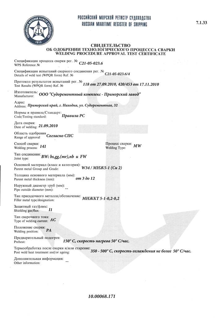 Свидетельство об одобрении технологического процесса сварки рег. № С21-05-023.27. Действительно до 06.12.2012 г.
