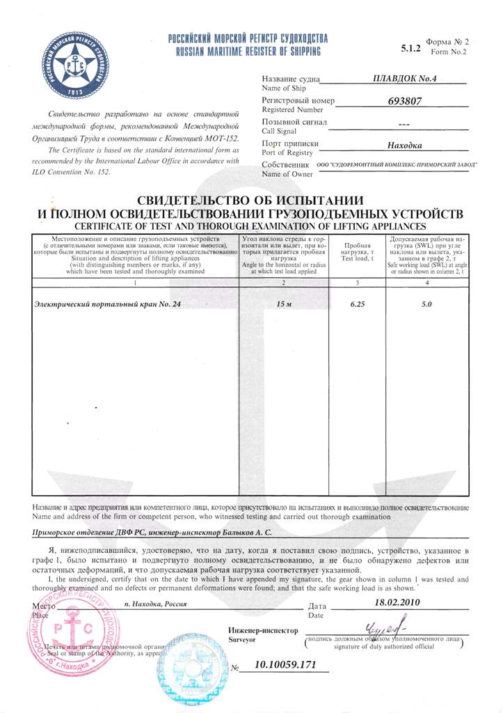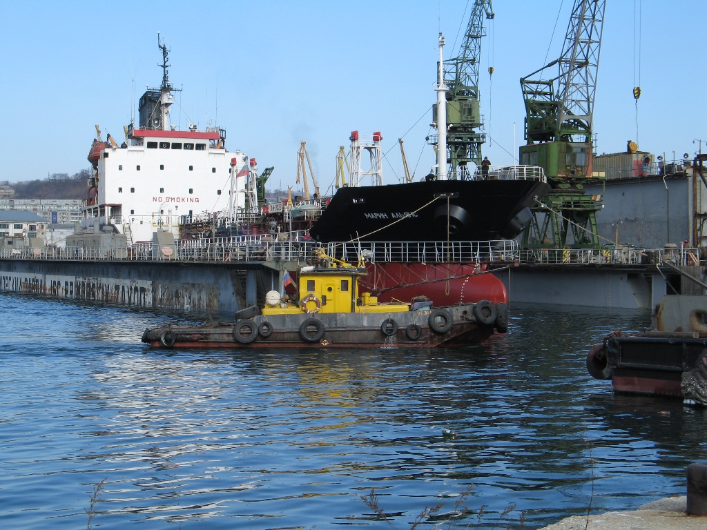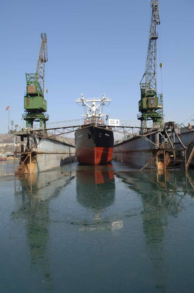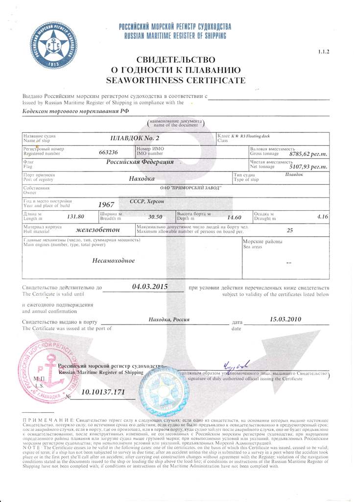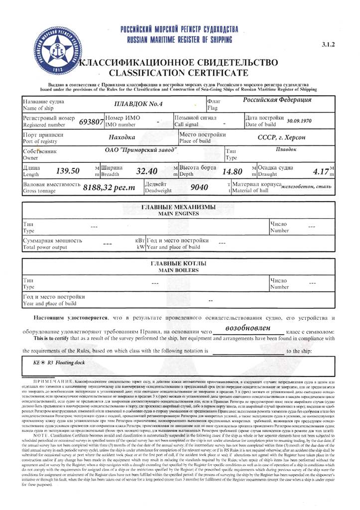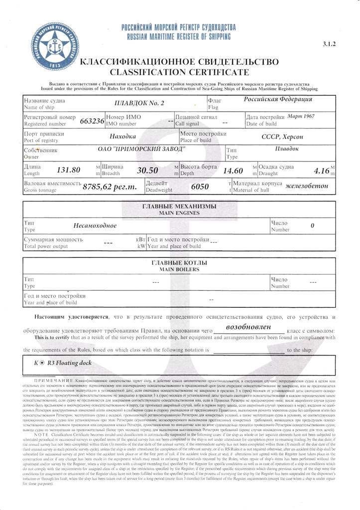 Док,№ Класс РМРС Проект Материал корпуса Грузоподъемность, т Длина, м Ширина, м Высота борта,м Осадка,м Валовая вместимость, рег.т Кол-во и грузоподъёмность кранов, т плавдок №2 K*R3 Floatimg dock 122 А бетон (понтон и башни) 6000 131,8 22 14,6 4,16 8 785,6 2x5 т плавдок №4 K*R3 Floatimg dock 1760 бетон (понтон), сталь (башни)
